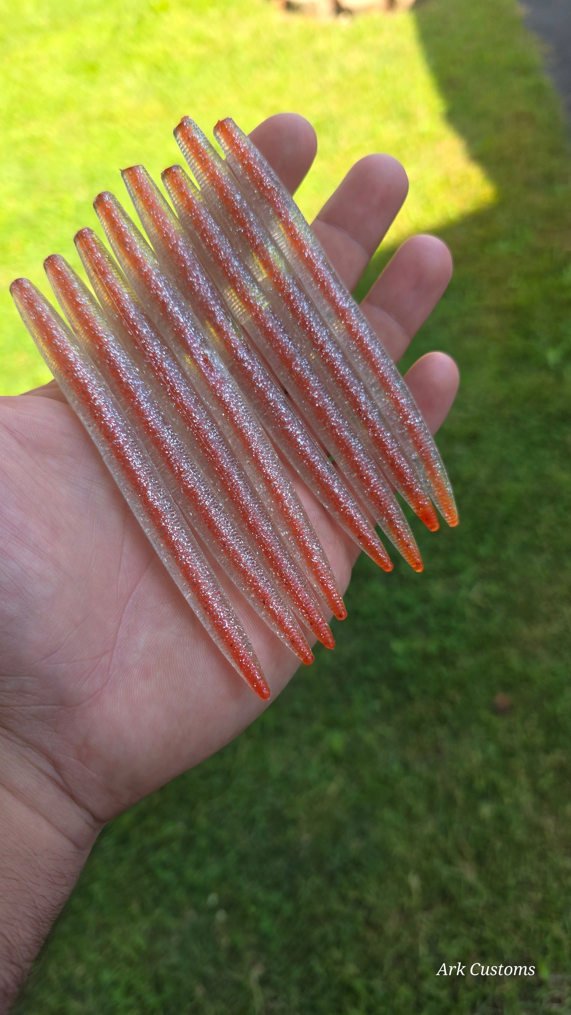 8pk of Core shot stick baits. Suggest light more transparent shell and a darker core for best results. Comment in the box at checkout for any custom colors. If you make a new color scheme you get to pick the name.